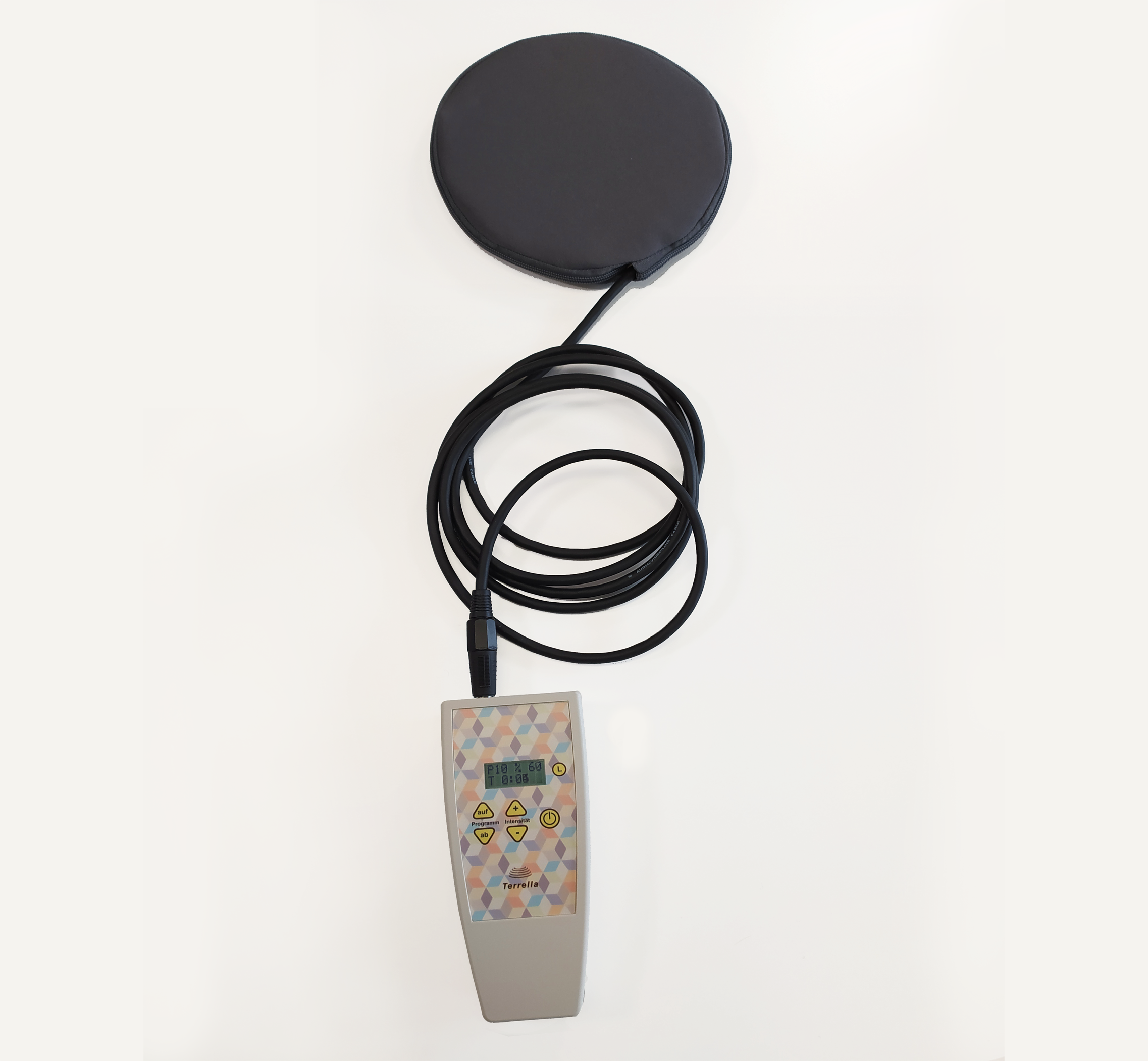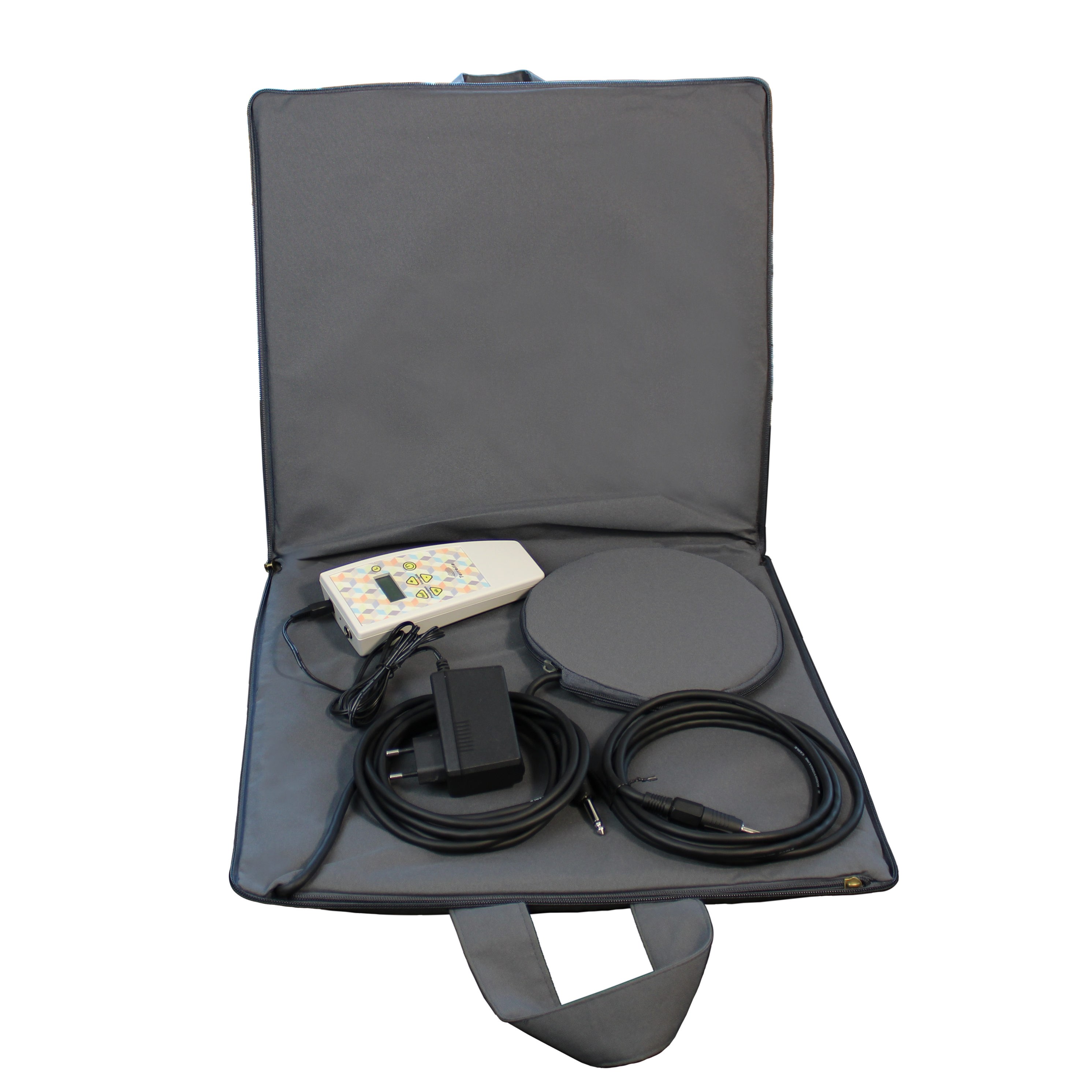 Lieferumfang: Steuergerät, Ladeadapter, Rechteckiges Kissen 80cm x 43 cm , Rundes Kissen 20 cm Durchmesser, Handbuch, Therapieleitfaden mit Programmvorschlägen.