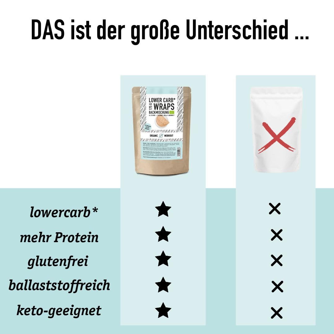 Über 70 % weniger Kohlenhydrate im Vergleich zu einem Weizenwrap (laut BML).