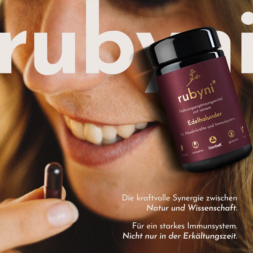 Das Immunsystem erfüllt eine Vielzahl wichtiger Aufgaben für unseren Körper. Und Sie können es tatkräftig durch eine gesunde, nachhaltige Ernährung unterstützen. Dabei leisten bereits 1–2 Kapseln rubyni® Edelholunder täglich einen zusätzlichen Beitrag im Rahmen Ihrer Ernährung – die Nahrungsergänzung für optimale Abwehrkräfte. rubyni® Edelholunder enthält 100% ElderCraft®, ein hochkonzentriertes und hochqualitatives Trockenextrakt aus den Schwarzen Edelholunderbeeren der Sorte Haschberg. Eine einzige Kapsel enthält die Kraft von mindestens 132 Beeren. rubyni® Edelholunder ist ein rein biologisches Produkt ohne Füllstoffe und wird sehr sorgsam durch eine spezielle und einzigartige Form der Ultrafiltration ohne Lösungsmittel und chemische Zusatzstoffe aus den Beeren des Edelholunders der Sorte Haschberg hergestellt. Bei rubyni® Edelholunder, pur in Kapseln verzichten wir auf die Zugabe weiterer Vitamine oder Ähnlichem, denn nur was rein ist, kann seine volle Kraft und Wirkung entfalten.