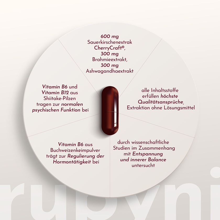 Im Zentrum stehen ausgewählte, hochwertige Extrakte aus Sauerkirschen, Safran, Brahmi und Ashwagandha, die eine ideale Basis bieten. Diese werden ergänzt durch speziell aufeinander abgestimmte Vitamin-Komplexe aus Buchweizen und Shiitake-Pilzen, die das hormonelle Gleichgewicht fördern und die psychische Gesundheit unterstützen.
